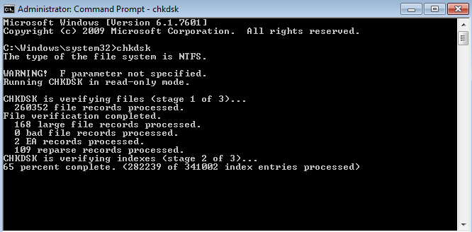 Do run the Command Prompt as an Administrator. You can do that by pressing the right click and select "Run as Administrator". A black window will appear. Type CHKDSK  and press enter. The program will scan your hard disk.